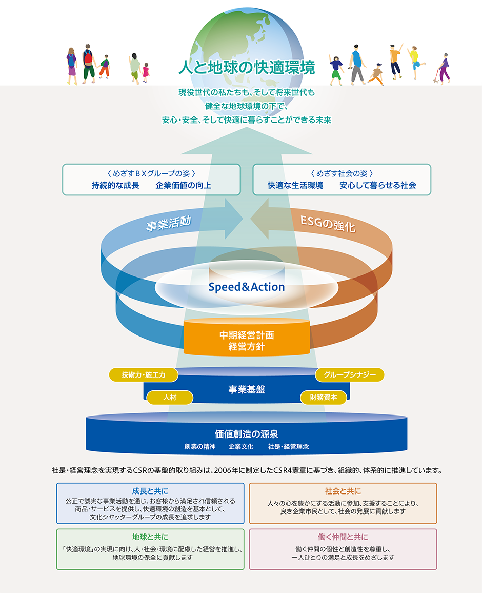 グループシナジーで発揮する強みを活かし、快適環境を追求する「ライフ・イン」「ライフロング・パートナーシップ」の2つのコンセプトを成長の基盤として、新たな価値を時代に先駆け提供する価値創造プロセスの実現に取り組んでいます。独自の成長モデルである「BX-CSV」(社会と共有する価値の創造)による持続可能な社会への貢献により、さらなる企業価値の向上をめざします。