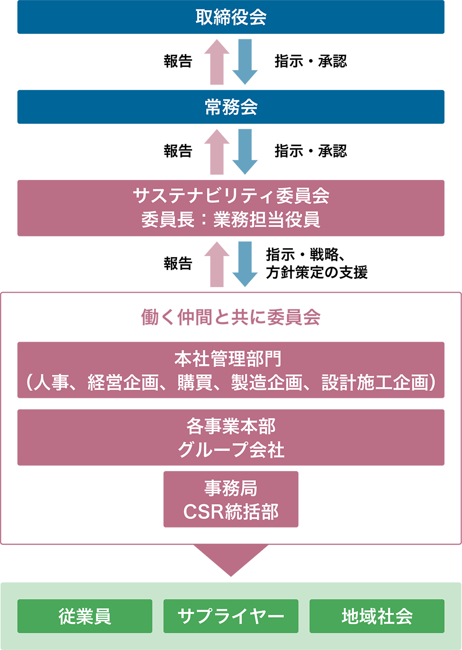 取り組みの状況や結果については、その重要性に鑑み、サステナビリティ委員長より常務会を通じて取締役会に報告されます。