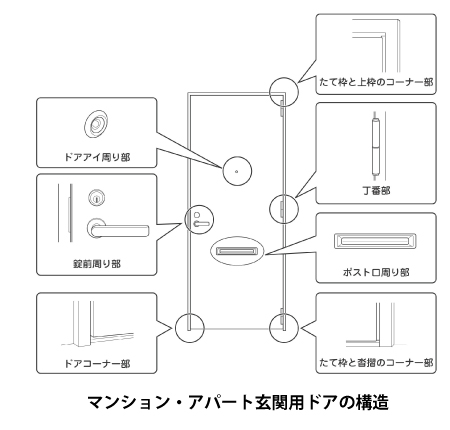 外部に面するマンション・アパート用玄関ドアについては、ドア及び枠の表面だけではなく、下図に記した部位について定期的に清掃を行ってください。