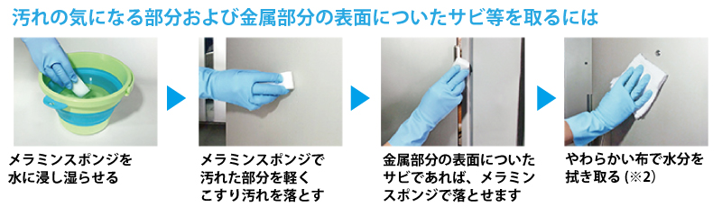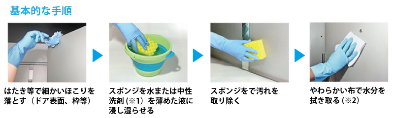 ※2 強く乾拭きしますと、ドアの表面をいためる原因になりますのでご注意ください。たわし・ワイヤーブラシ・サンドペーパーなどを使用しないでください。製品に傷が付き「さび」や変色などの原因になります。